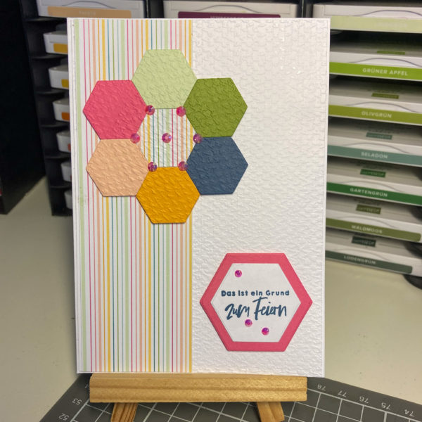- Mit dem Stanzenset „geometrisch abstrakt“ werden 7 kleine Sechsecke ausgestanzt, 6 Stück einfarbig und 1 Stück aus dem DSP.